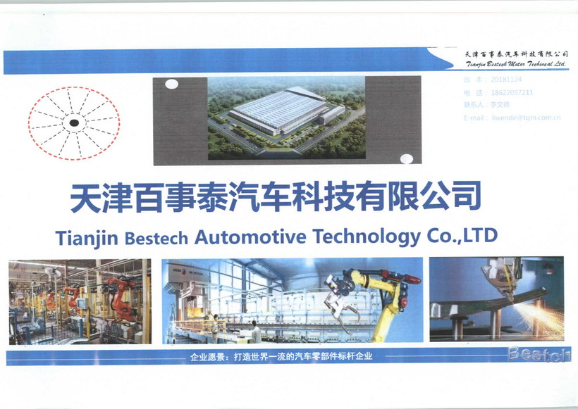 天津百事泰汽車科技有限公司,交通便利,位于天津空港經濟區(qū),距離天津機場3公里,緊鄰京津塘高速,注冊資金5000萬元;占地面積5800平方米,一期總設備投資3500萬元,主營業(yè)務為熱沖壓零件生產、產品研發(fā)。